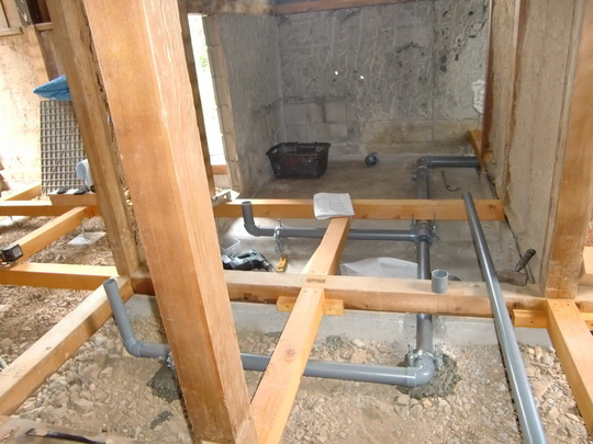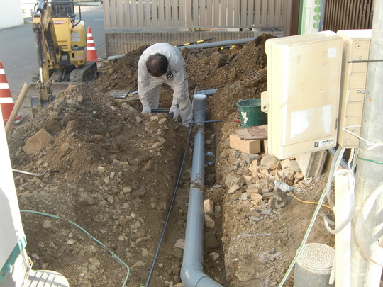 外装工事が完了し、仮設足場を撤去したので、給排水の外部配管を行っております。