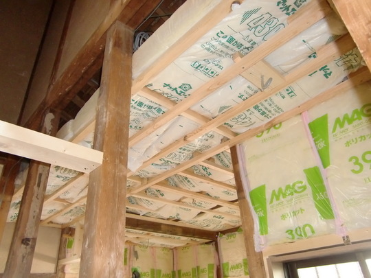 天井の木下地を組み、断熱材を敷き石膏ボードを張ります(^^)b