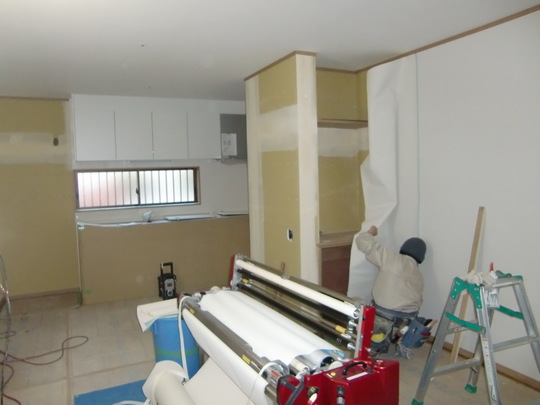 室内の壁・天井仕上の内装クロス貼りが進んでます。一気に明るい部屋に仕上がっていきます。(^^)