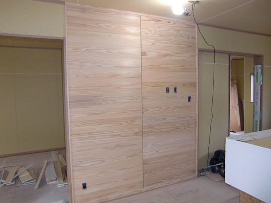 大工造作も最終段階で建具枠・ボード張りが完了し、アクセント壁に杉板を張りました。(^^)v