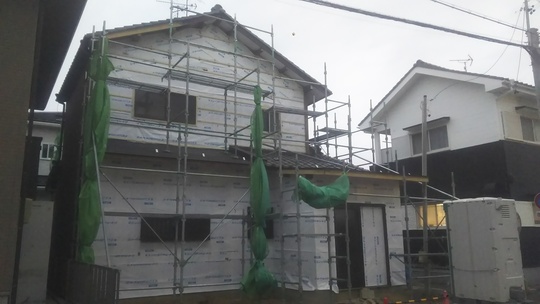 サッシ取付け防水紙張りが完了し、外壁下地の施工中!