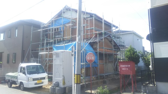 外装工事に取り掛かる前に仮設足場を造り安全作業です!