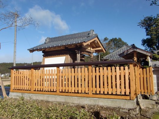 解体時に腐食していた部分も、当時の施工より腐食しにくい施工を取り入れ、この先、数十年保つように心掛けました。また、当時は門の出入り部分に土台があり跨いで通るのを、施工中に打合せ・変更して土台と基礎をCUTして緩やかな階段に仕上げ、出入りしやすいように配慮しました。(^^)b