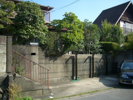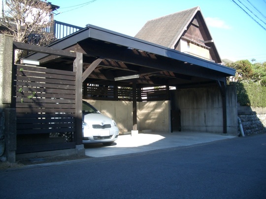 庭を削り擁壁造り、木造車庫で3台駐車とした。