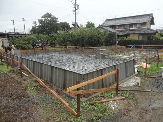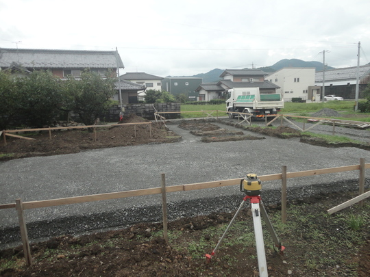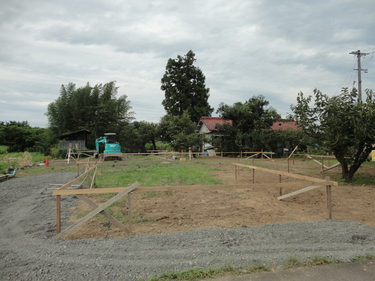基礎着工の始めは『丁張り』といって、建物の位置と高さの基準となる作業を行います。(^^)v