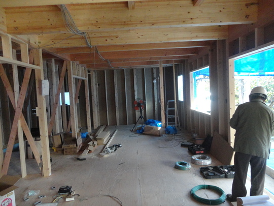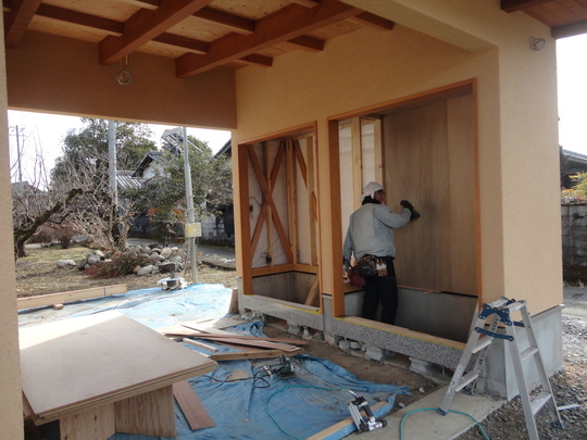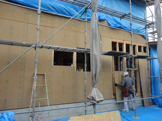 大工造作は外壁廻りの耐力面材を貼ります。貼って無い所は窓サッシの取付予定です。(^^)b