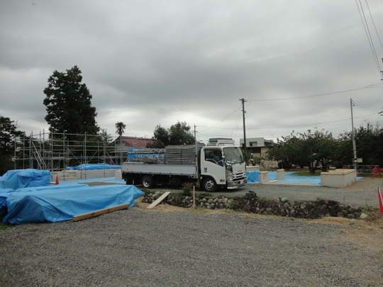 建前に備えて構造材を搬入し仮設足場の組立ても始まりました!