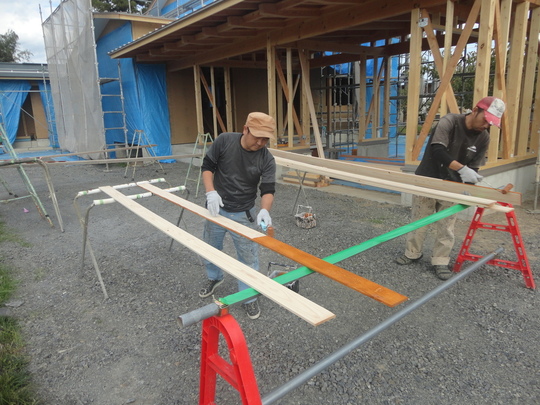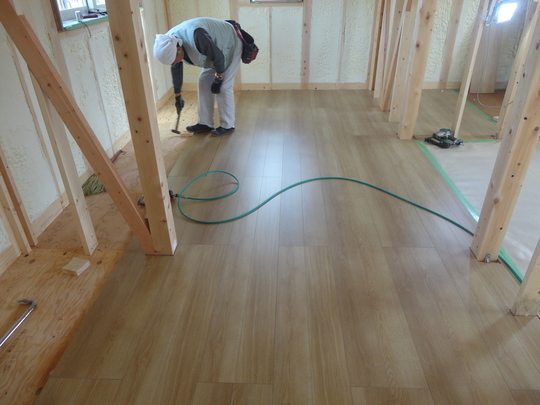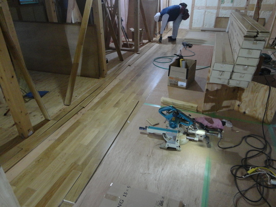 1階の大工造作は床仕上でタモの無垢材を貼り進めます!