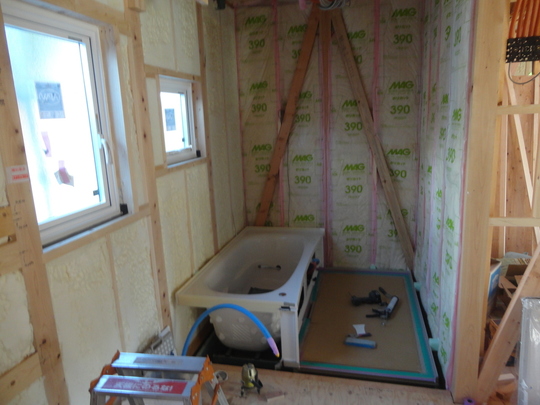 断熱吹付が完了し、ユニットバスの 設置を行います。