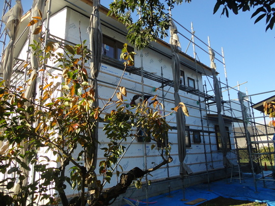 サッシ取付が完了し透湿防水紙を貼って外壁木下地を施工中です。