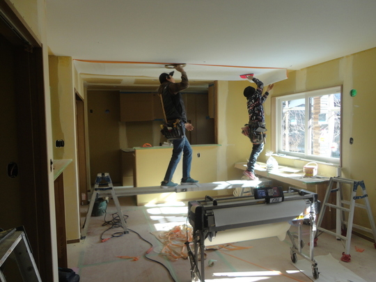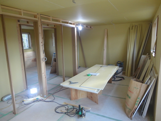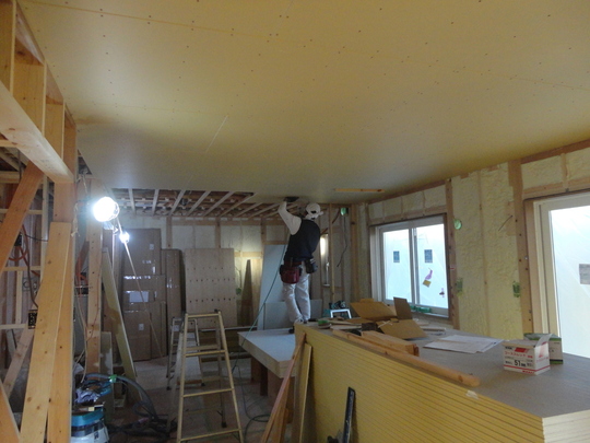 大工造作は2階の建具枠取付後に天井・壁ボード貼りが進んでます。