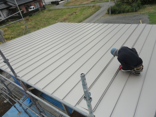 ガレージ屋根は緩勾配なので立ちハゼ葺きで施工しています。