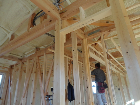 断熱吹付が完了し、2階の大工造作は天井木下地を組みます!