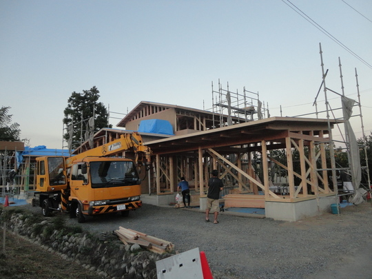 1階柱建てから始めます。レッカーにて梁を組む準備も進みます。