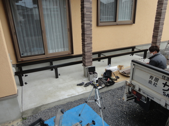 テラスには人工木のデッキ材を組立てが進んでおります。