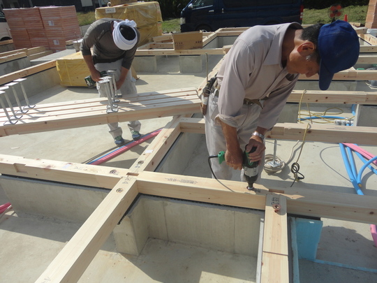 土台を基礎に固定し鋼製束を取付して床の水平を確認します!