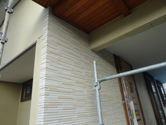 外壁仕上げのタイル貼りをアクセントで 玄関前の壁に施工しました(^^)b