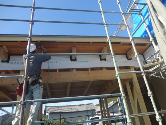 大工造作は外部軒裏の板貼り中で真鍮釘で丁寧に貼っていきます!