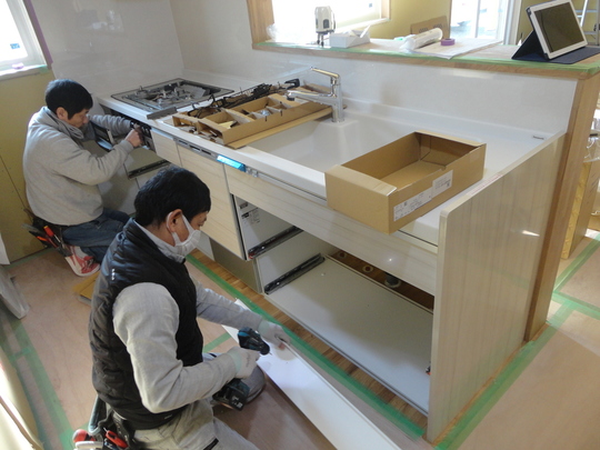 大工造作完了し内装クロス前にシステムキッチン設置を行います!