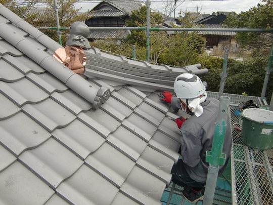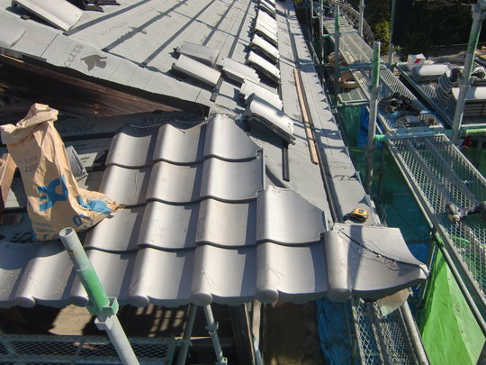 屋根瓦葺きは、棟を残すのみとなりました。(^^)b