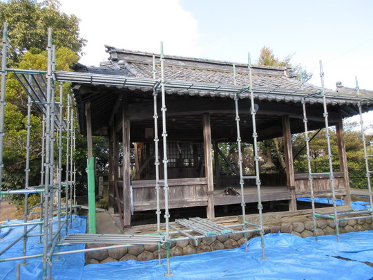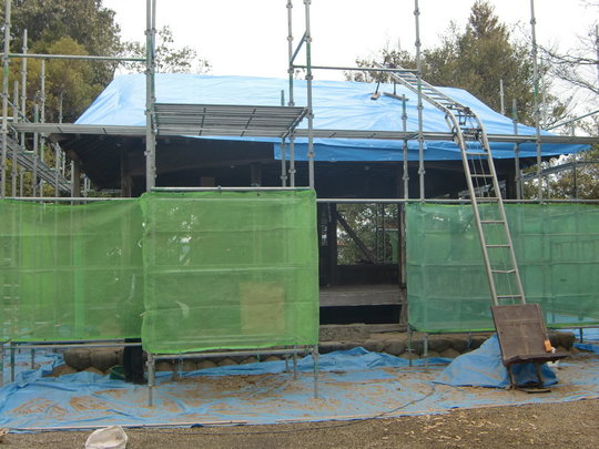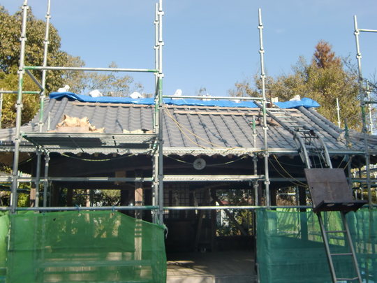 いよいよ着工です。まずは仮設足場の組立てを行います!屋根左部の垂木が折れて危険なため支えを立てていたのです。(>_<)