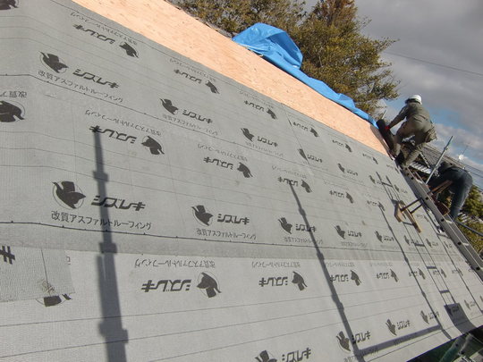 木工事が完了すると屋根防水ルーフィングを貼ります。(^^)b